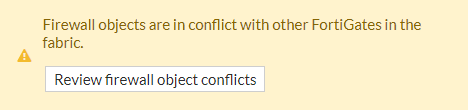 - Go to Security Fabric > Fabric Connectors. In the topology tree, there is a message that Firewall objects are in conflict with other FortiGates in the fabric.