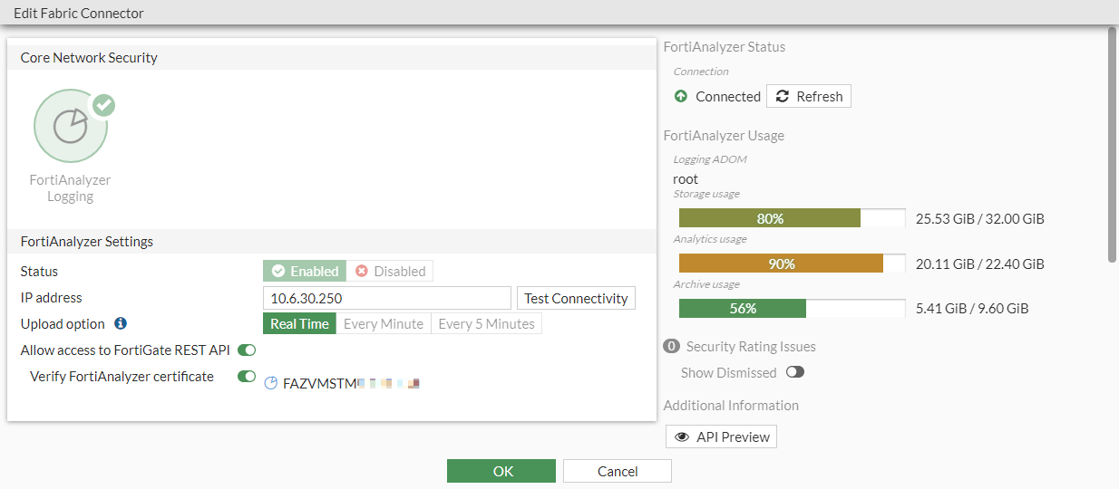 - Go to Security Fabric > Fabric Connectors and double-click the FortiAnalyzer Logging card.