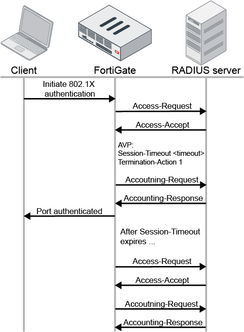 In a wired scenario, a hardware switch configured with 802.1X security authentication can read the Termination-Action attribute value from the RADIUS Access-Accept response. If the Termination-Action is 1, the FortiGate will initiate re-authentication when the session time has expired. During re-authentication, the port stays authorized. If the Termination-Action is 0, the session will be terminated.