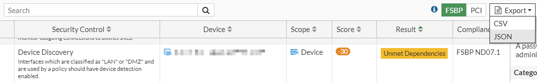The report includes the security controls that were tested against, linking to specific FSBP or PCI compliance policies. Click the FSBP and PCI buttons to reference the corresponding standard. Users can search or filter the report results. If there is a failed check on the scorecard, there is a link in the Recommendations section that takes you to the page to resolve the problem.