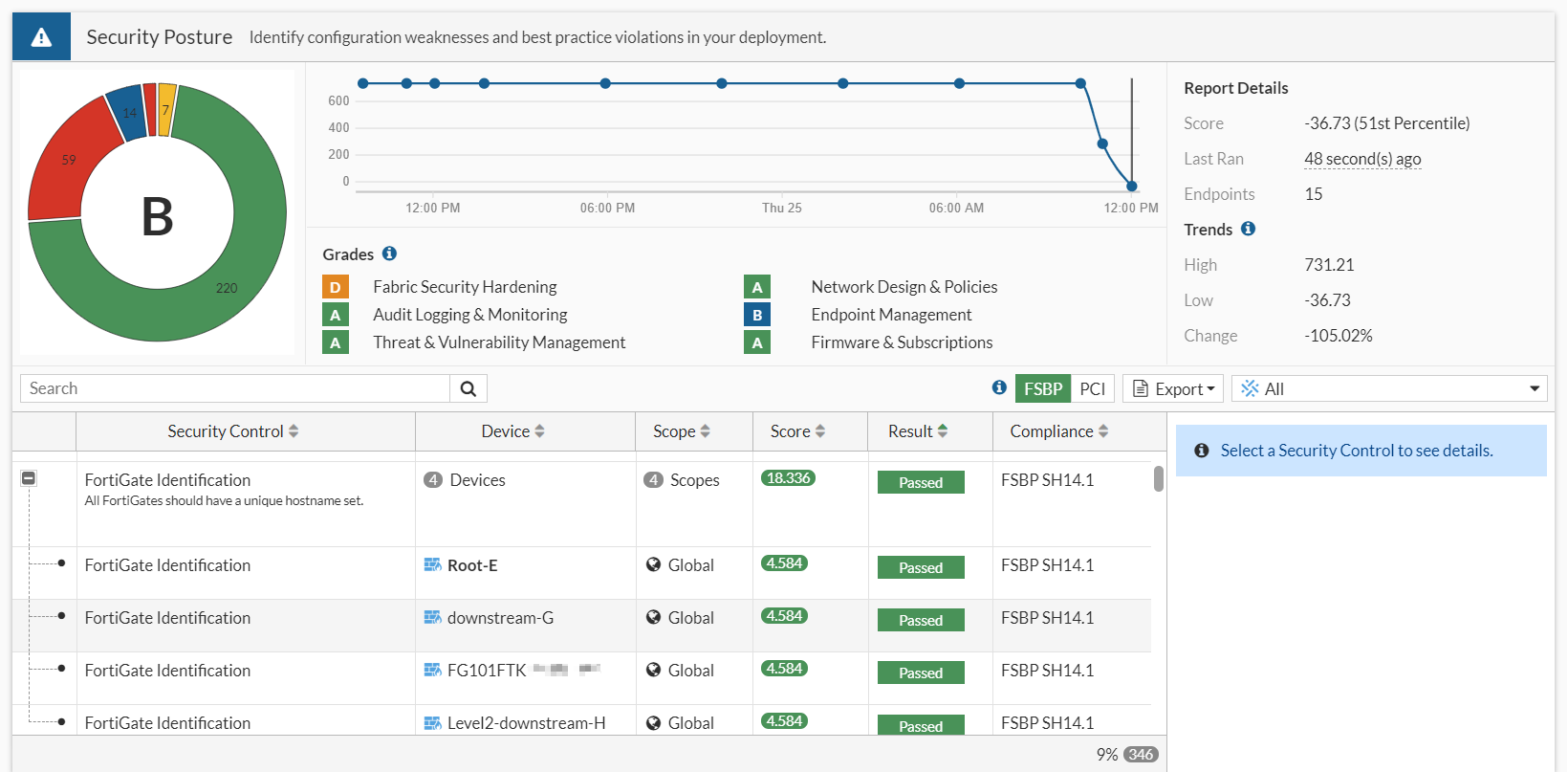 The security rating uses real-time monitoring to analyze your Security Fabric deployment, identify potential vulnerabilities, highlight best practices that can be used to improve the security and performance of your network, and calculate Security Fabric scores.