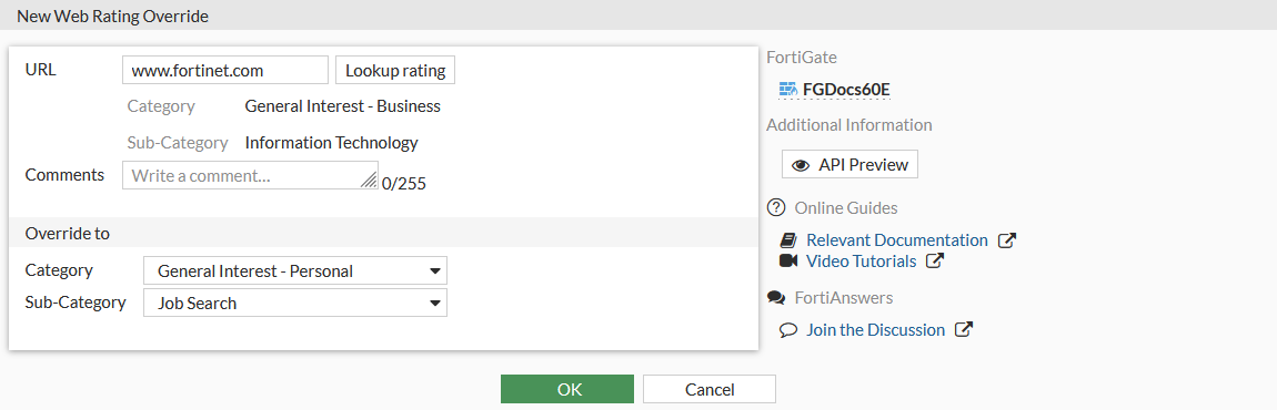 URL Enter the URL to override. Lookup rating Select to view any current Category and Sub-Category ratings. Comments Enter a comment (optional). Override to Category Select a FortiGuard category, threat feed remote category, or a Custom Category. Sub-Category