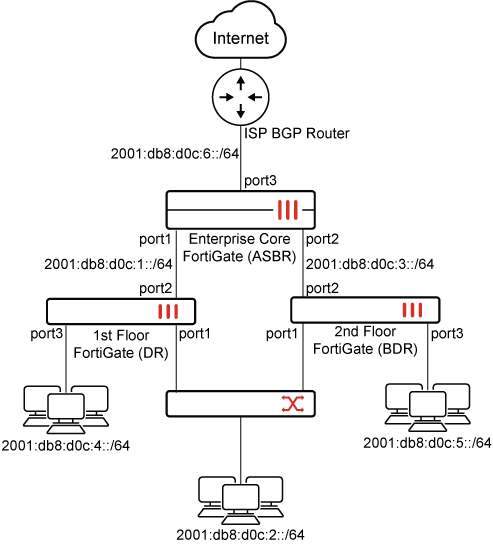 • Enterprise Core FortiGate redistributes BGP routes into the OSPF AS and peers with the ISP BGP Router over eBGP. For information about configuring BGP, see Basic IPv6 BGP example.
