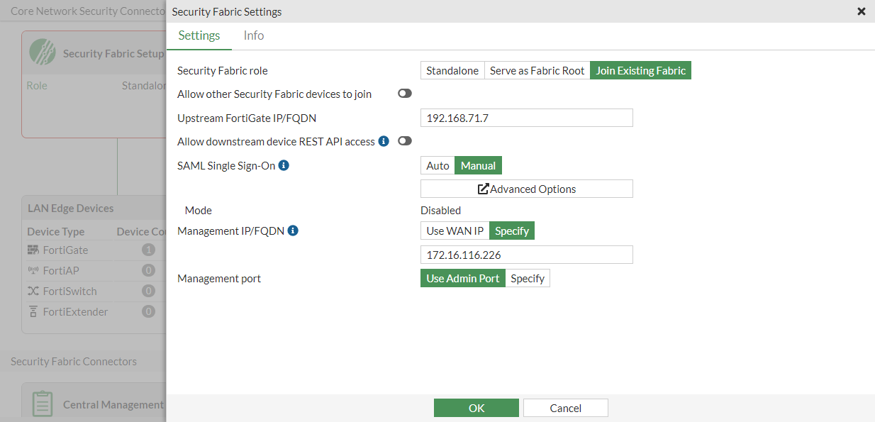 - In the Settings tab, set the Security Fabric role to Join Existing Fabric.