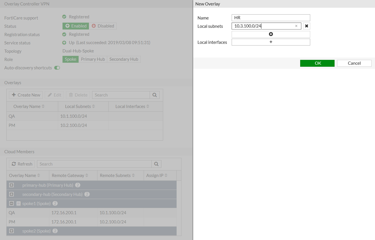 config vpn ocvpn set status enable set multipath disable config overlays edit 1 set name "QA" config subnets edit 1 set type interface set interface "lan1" next end next edit 2 set name "PM" config subnets edit 1 set type interface set interface "lan2" next end next end end - Configure Branch3: