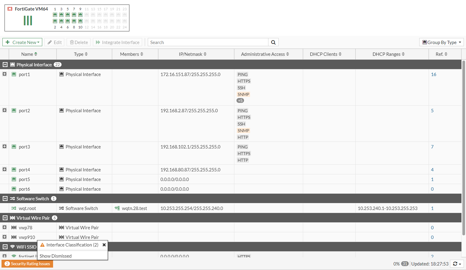 On the Network > Interfaces page, there is a Security Rating Issues section in the table footer. Click Security Rating Issues to view the list of issues. To dismiss a notification, click the X beside it. To view dismissed notifications, click Show Dismissed.