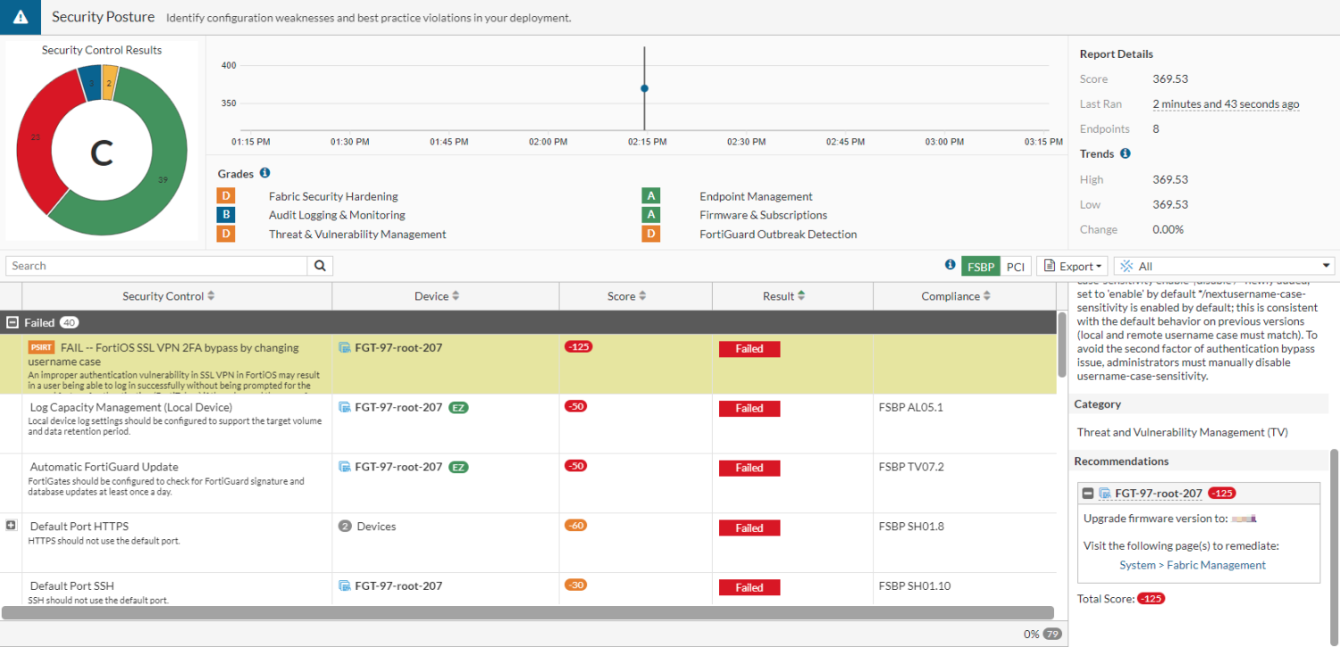 The security rating uses real-time monitoring to analyze your Security Fabric deployment, identify potential vulnerabilities, highlight best practices that can be used to improve the security and performance of your network, and calculate Security Fabric scores.