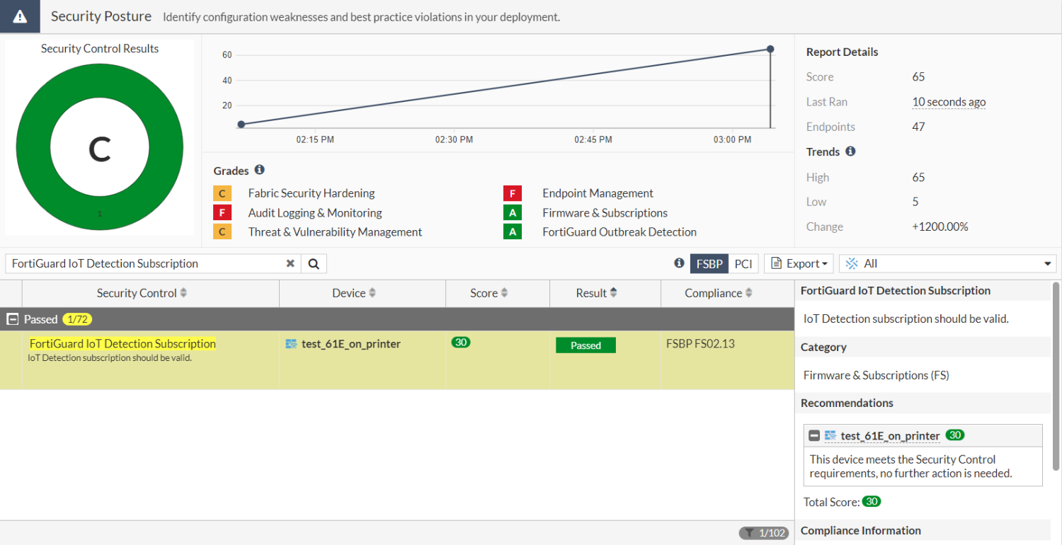 The FortiGuard IoT Vulnerability rating check will fail if any IoT vulnerabilities are found. In this example, the result is marked as Failed because there is a device with IoT vulnerabilities.