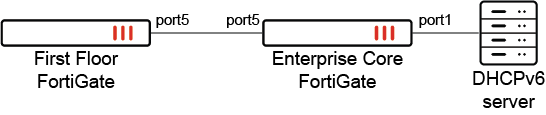 A downstream interface (port5) connects the First Floor FortiGate to the Enterprise Core FortiGate. The First Floor FortiGate interface (port5) is configured to receive the IPv6 address and DNS server address from the Enterprise Core FortiGate using DHCP addressing mode or auto-configuration.