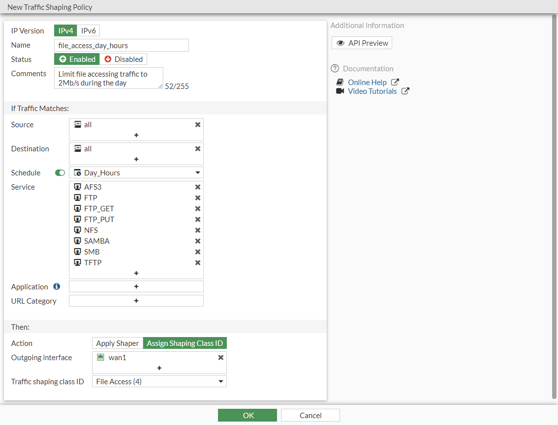 config firewall shaping-policy edit 2 set name "web_access_day_hours" set comment "Limit web accessing traffic to 8Mb/s in day time" set service "HTTP" "HTTPS" set schedule "Day_Hours" set dstintf "wan1" set class-id 3 set srcaddr "all" set dstaddr "all" next edit 3 set name "file_access_day_hours" set comment "Limit file accessing traffic to 2Mb/s during the day" set service "AFS3" "FTP" "FTP_GET" "FTP_PUT" "NFS" "SAMBA" "SMB" "TFTP" set schedule "Day_Hours" set dstintf "wan1" set class-id 4 set srcaddr "all" set dstaddr "all" next end