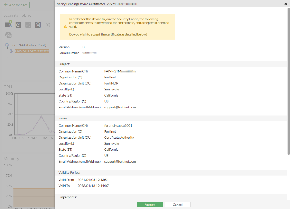 - Configure and authorize the FortiGate in the FortiNDR GUI to join the Security Fabric: