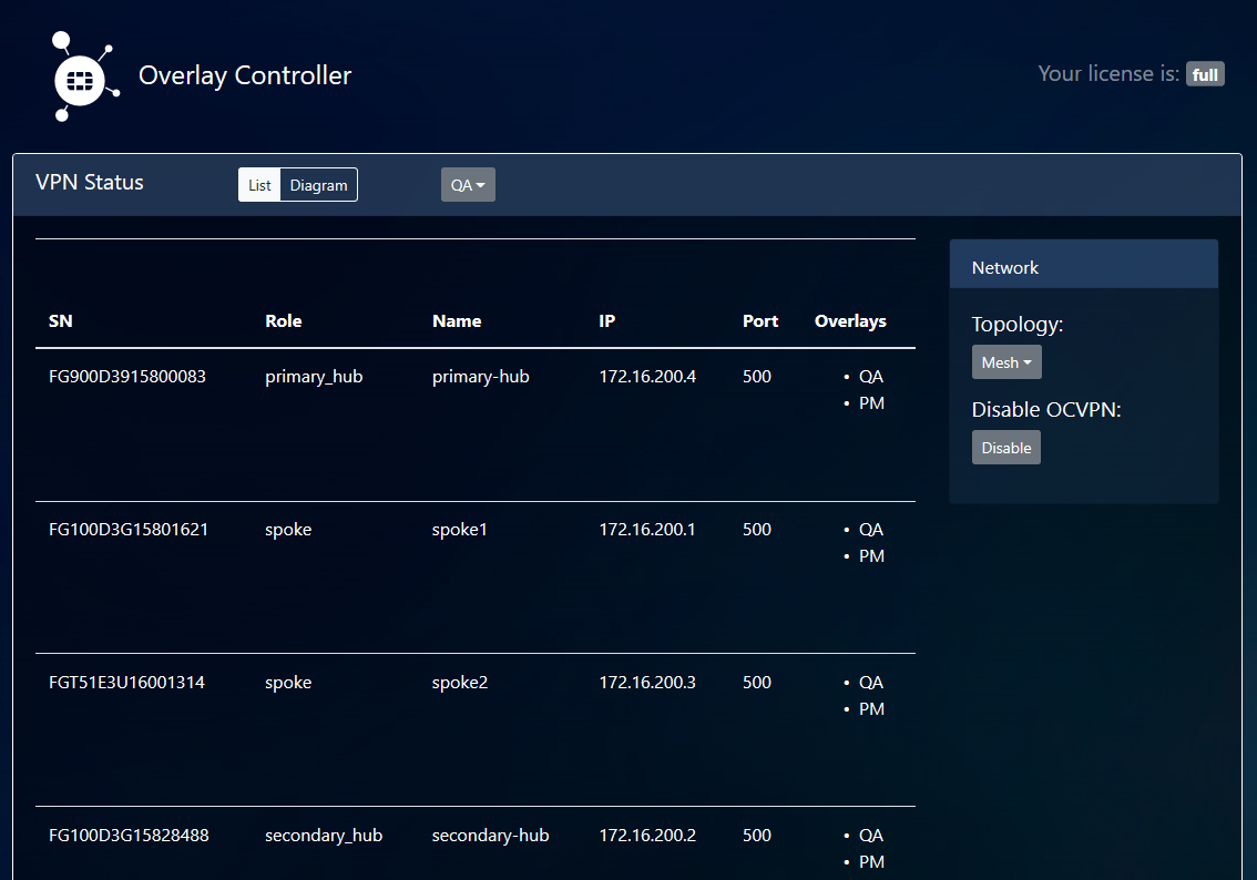 When you log into the OCVPN portal, the OCVPN license type and device information display. The device information includes the device serial number, OCVPN role, hostname, public IP address, port number, and overlays.