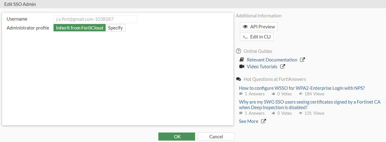 In this example, a local administrator changes the permissions of an existing FortiCloud SSO user (created in the previous example) to Inherit from FortiCloud, which means the super_admin profile will be used.