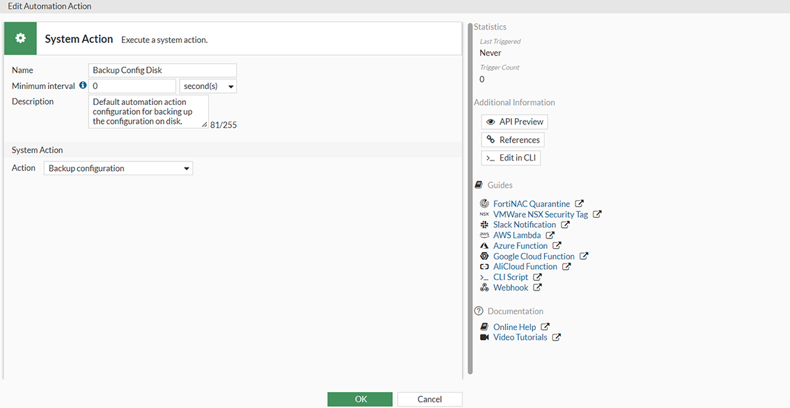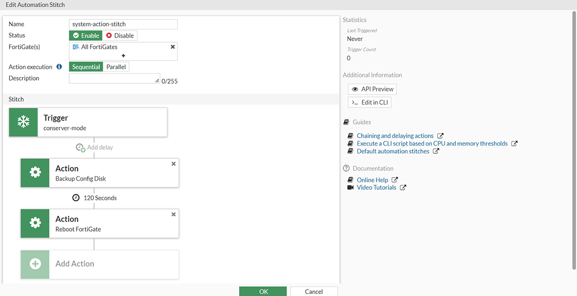 In this example, an automation stitch is created that uses a low-memory event trigger, a backup-config action to back up the configuration to the FortiGate's disk (see Configuration backups and reset for more details), and then a reboot action to reboot the FortiGate. There is a 120-second delay between the two actions.