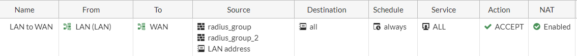 - For Source, click User then select radius_group and radius_group_2. Click Address and select LAN address.