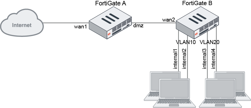 In this example, two hardware switch ports are assigned VLAN10, and two ports are assigned VLAN20 on FortiGate B. The wan2 interface is designated as the trunk port, and is connected to the upstream FortiGate A. The corresponding VLAN subinterfaces VLAN10 and VLAN20 on the upstream FortiGate allow further access to other networks.