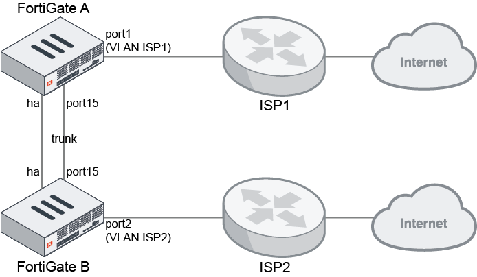 In this example, two FortiGates in an HA cluster are connected to two ISP routers. Instead of connecting to external L2 switches, each FortiGate connects to each ISP router on the same hardware switch port on the same VLAN. A trunk port connects the two FortiGates to deliver the 802.1Q tagged traffic to the other. A full mesh between the FortiGate cluster and the ISP routers is achieved where no single point of failure will cause traffic disruptions.