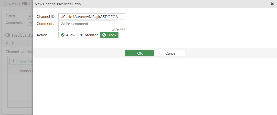 In the following example, the Fortinet YouTube channel ID (UCJHo4AuVomwMRzgkA5DQEOA) is blocked, and the video filter is applied to a policy.