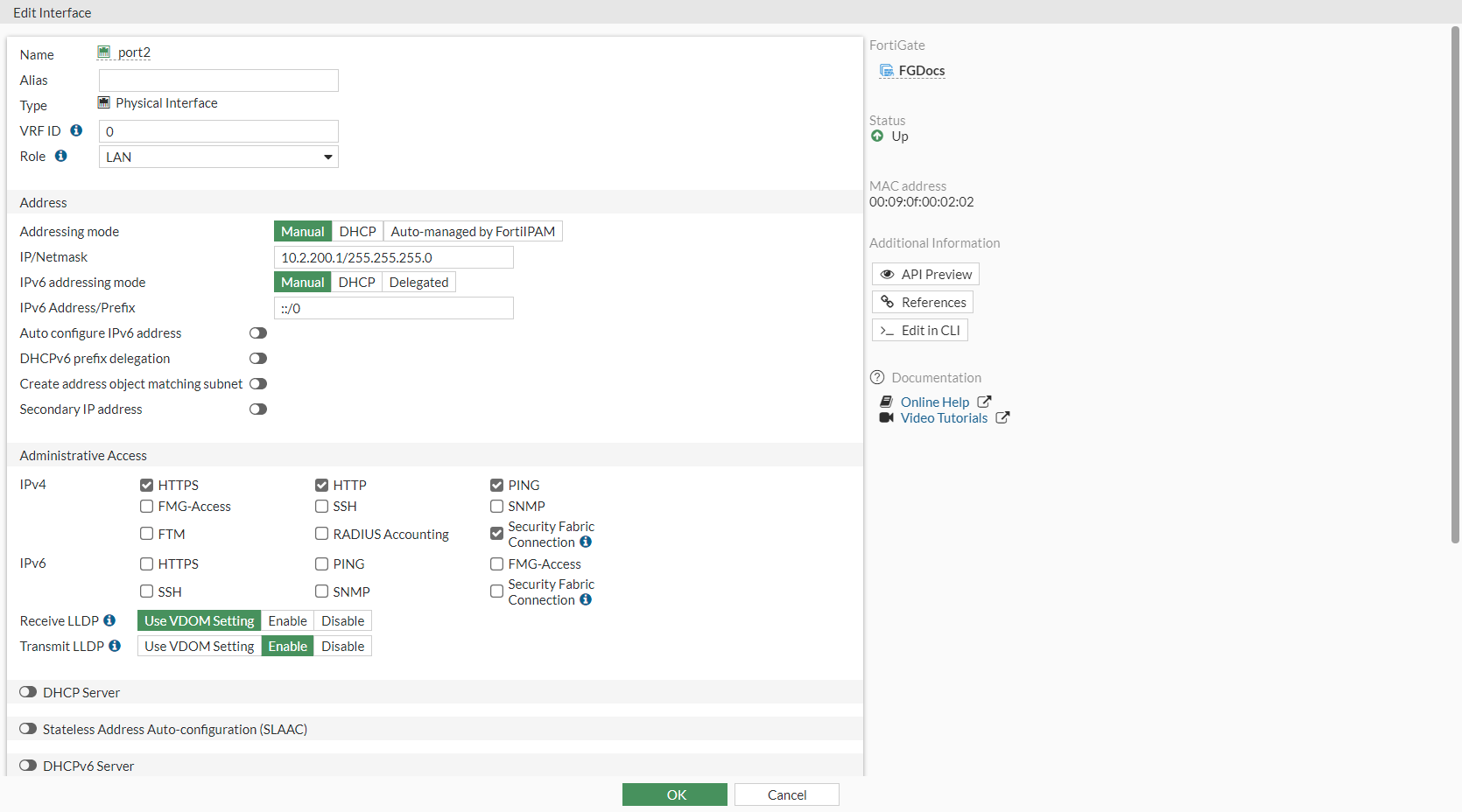 - If the interface's role is WAN, under Administrative Access, set Receive LLDP to Enable and Transmit LLDP to Use VDOM Setting.