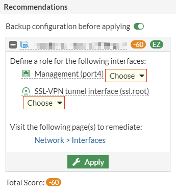 Certain remediations marked with an EZ symbol represent configuration recommendations that support Easy Apply. In the panel on the right, in the Recommendations section, click Apply to apply the changes to resolve the failed security control.