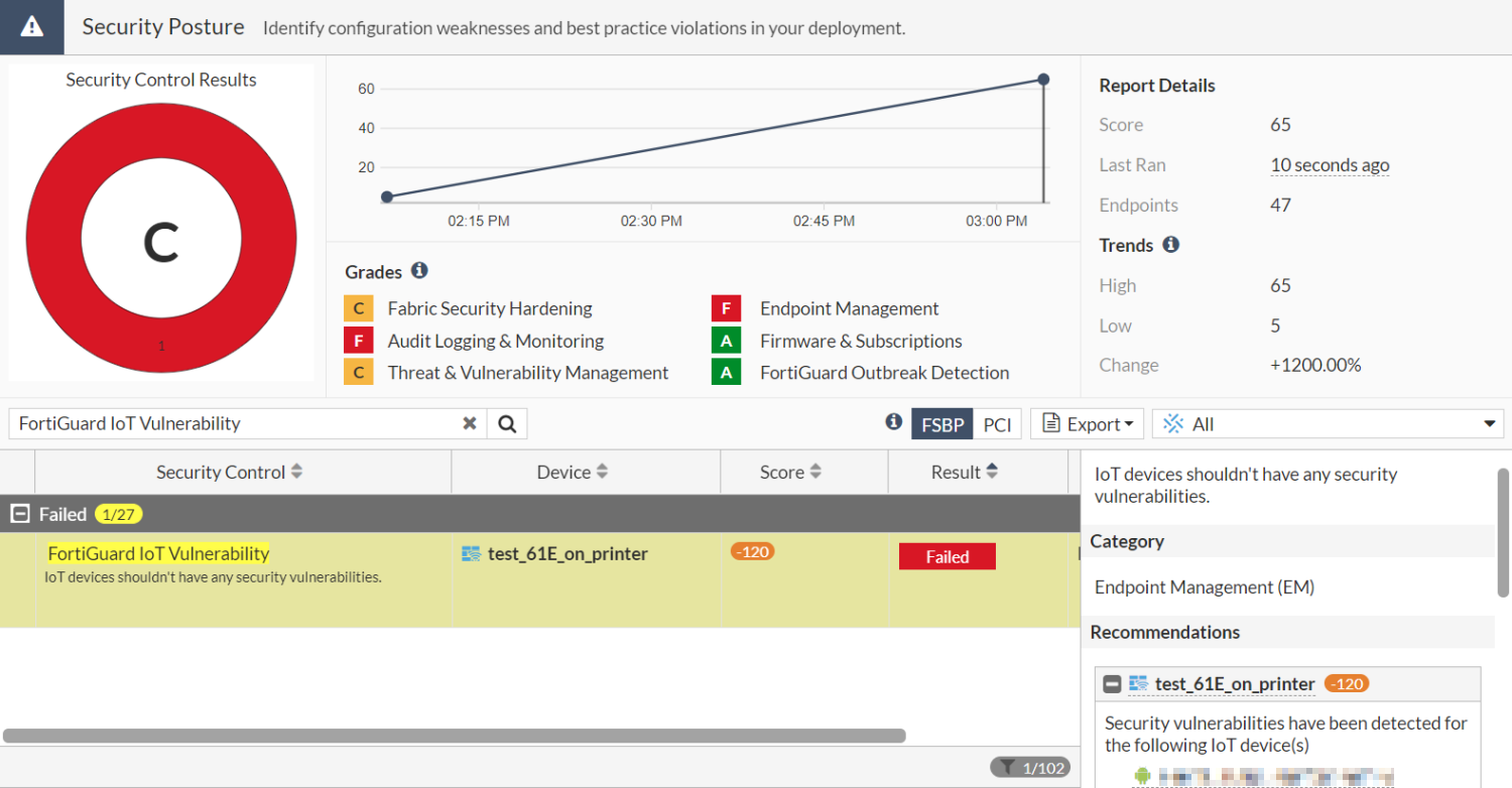 The FortiGuard IoT Vulnerability rating check will fail if any IoT vulnerabilities are found. In this example, the result is marked as Failed because there is a device with IoT vulnerabilities.