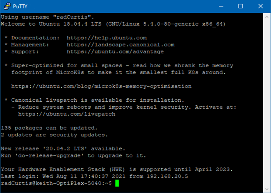 Open an SSH client, such as PuTTy, and make an SSH connection to radCurtis@192.168.20.1 on port 22.