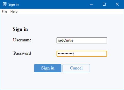After device authentication is performed and passes in the background, FortiClient prompts the user to sign in. Enter the username, radCurtis, and password, then click Sign in.