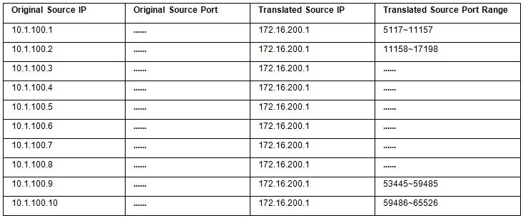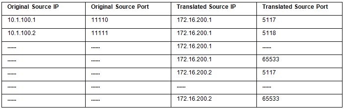For instance, if we define one external IP address (172.16.200.1) and ten internal IP addresses (10.1.100.1-10.1.100.10), we have translation IP+Port combination like following table: