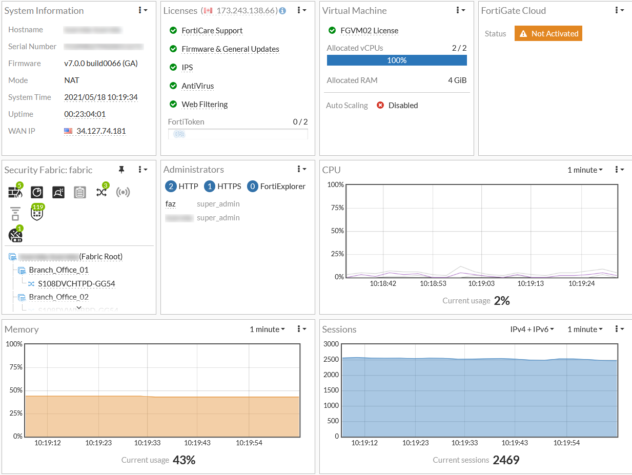 The Status dashboard provides an overview of your FortiGate device and the devices in your Security Fabric. If your FortiGate is a virtual machine, information about the virtual machine is also displayed in the dashboard.