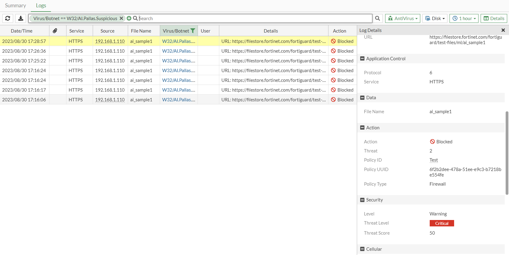 # execute log filter category 2 # execute log display date=2023-08-30 time=17:28:57 eventtime=1693441737721077640 tz="-0700" logid="0211008192" type="utm" subtype="virus" eventtype="infected" level="warning" vd="root" policyid=1 poluuid="c65fa590-4758-51ee-4d28-f2cc75f14979" policytype="policy" msg="File is infected." action="blocked" service="HTTPS" sessionid=1179 srcip=192.168.1.110 dstip=209.52.38.129 srcport=63117 dstport=443 srccountry="Reserved" dstcountry="Canada" srcintf="internal1" srcintfrole="undefined" dstintf="wan1" dstintfrole="wan" srcuuid="6c43f8d6-478a-51ee-95d8-31177232e869" dstuuid="6c43f8d6-478a-51ee-95d8-31177232e869" proto=6 direction="incoming" filename="ai_sample1" quarskip="Quarantine-disabled" virus="W32/AI.Pallas.Suspicious" viruscat="Virus" dtype="av-engine" ref="http://www.fortinet.com/ve?vn=W32%2FAI.Pallas.Suspicious" virusid=8187637 url="https://filestore.fortinet.com/fortiguard/test-files/ml/ai_sample1" profile="default" agent="Mozilla/5.0 (Windows NT 10.0; Win64; x64; rv:109.0) Gecko/20100101 Firefox/117.0" httpmethod="GET" referralurl="https://www.fortiguard.com/" analyticscksum="7057e364dbf09b6de7a6cc152b8967e50ed86a0edf97cfd2e88b142ac41873f0" analyticssubmit="false" crscore=50 craction=2 crlevel="critical"