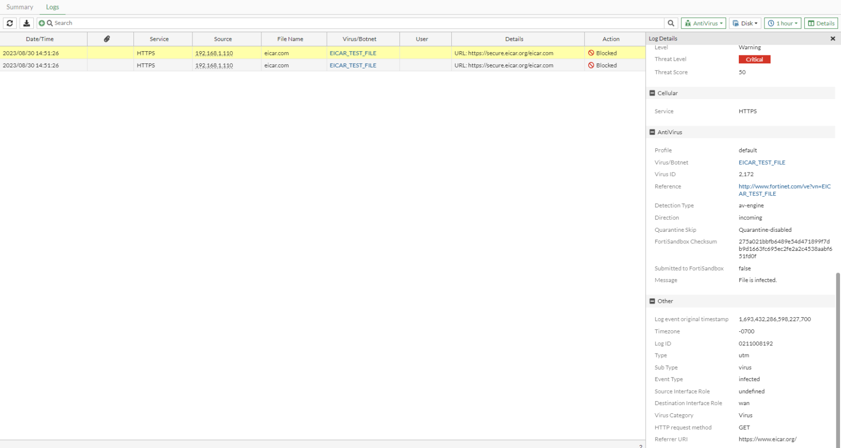 # execute log filter category 2 # execute log display date=2023-08-30 time=14:51:26 eventtime=1693432286598227820 tz="-0700" logid="0211008192" type="utm" subtype="virus" eventtype="infected" level="warning" vd="root" policyid=1 poluuid="c65fa590-4758-51ee-4d28-f2cc75f14979" policytype="policy" msg="File is infected." action="blocked" service="HTTPS" sessionid=15797 srcip=192.168.1.110 dstip=89.238.73.97 srcport=64641 dstport=443 srccountry="Reserved" dstcountry="Germany" srcintf="internal1" srcintfrole="undefined" dstintf="wan1" dstintfrole="wan" srcuuid="ab8d1c24-30b1-51ee-138a-f7be846c205d" dstuuid="ab8d1c24-30b1-51ee-138a-f7be846c205d" proto=6 direction="incoming" filename="eicar.com" quarskip="Quarantine-disabled" virus="EICAR_TEST_FILE" viruscat="Virus" dtype="av-engine" ref="http://www.fortinet.com/ve?vn=EICAR_TEST_FILE" virusid=2172 url="https://secure.eicar.org/eicar.com" profile="default" agent="Mozilla/5.0 (Windows NT 10.0; Win64; x64; rv:109.0) Gecko/20100101 Firefox/116.0" httpmethod="GET" referralurl="https://www.eicar.org/" analyticscksum="275a021bbfb6489e54d471899f7db9d1663fc695ec2fe2a2c4538aabf651fd0f" analyticssubmit="false" crscore=50 craction=2 crlevel="critical"
