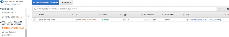 - Go to Virtual Private Network (VPN) > Virtual Private Gateways to confirm that a virtual private gateway (VPG) has been created. In this case it is attached to the Cloud_onRamp VPC that contains the FortiGate and servers.