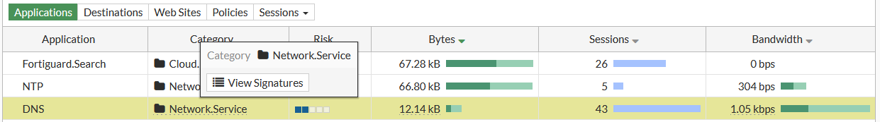 - Click the tabs to sort the sessions by Application, Destinations, Web Sites, or Policies.