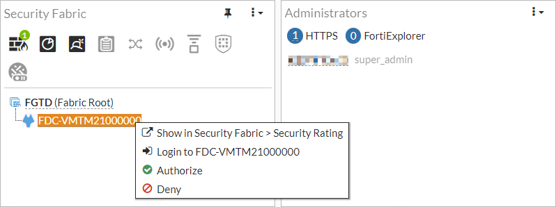 config system csf set status enable set group-name "csf-d" set downstream-access enable set downstream-accprofile "super_admin" end - In FortiDeceptor, integrate the device: