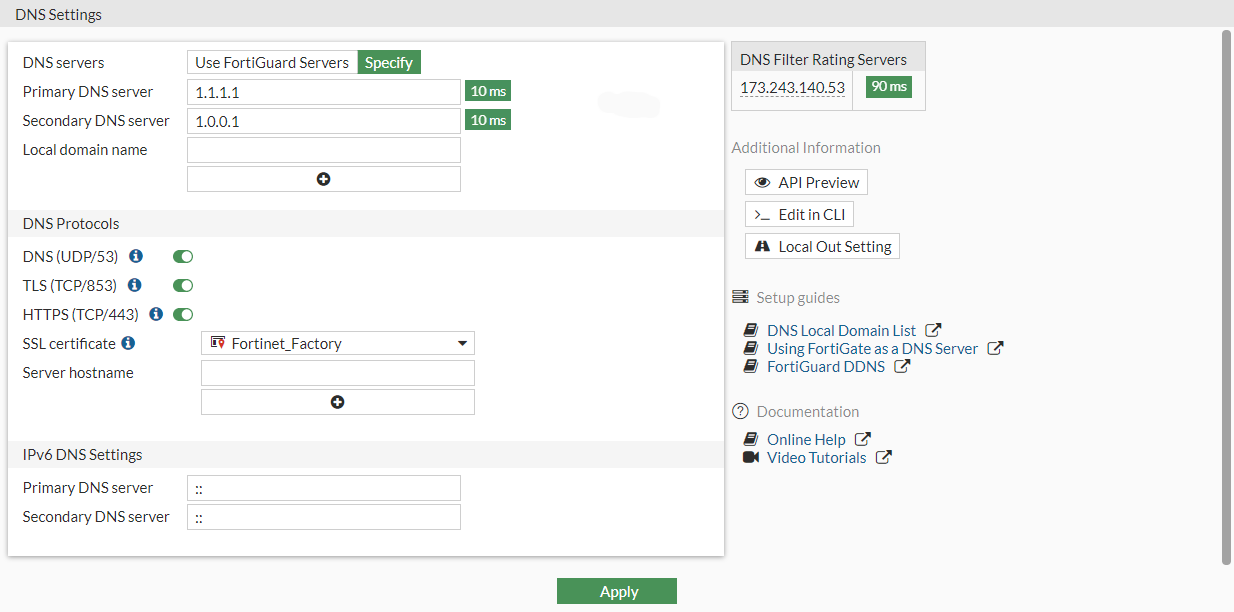 config system dns set primary 1.1.1.1 set secondary 1.0.0.1 set protocol dot end - Configure the DNS filter profile: