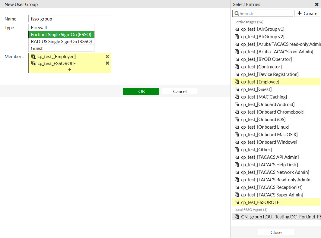 FSSO groups can come from multiple sources; CPPM FSSO groups are prefixed with cp_ and are listed under the FortiManager heading.