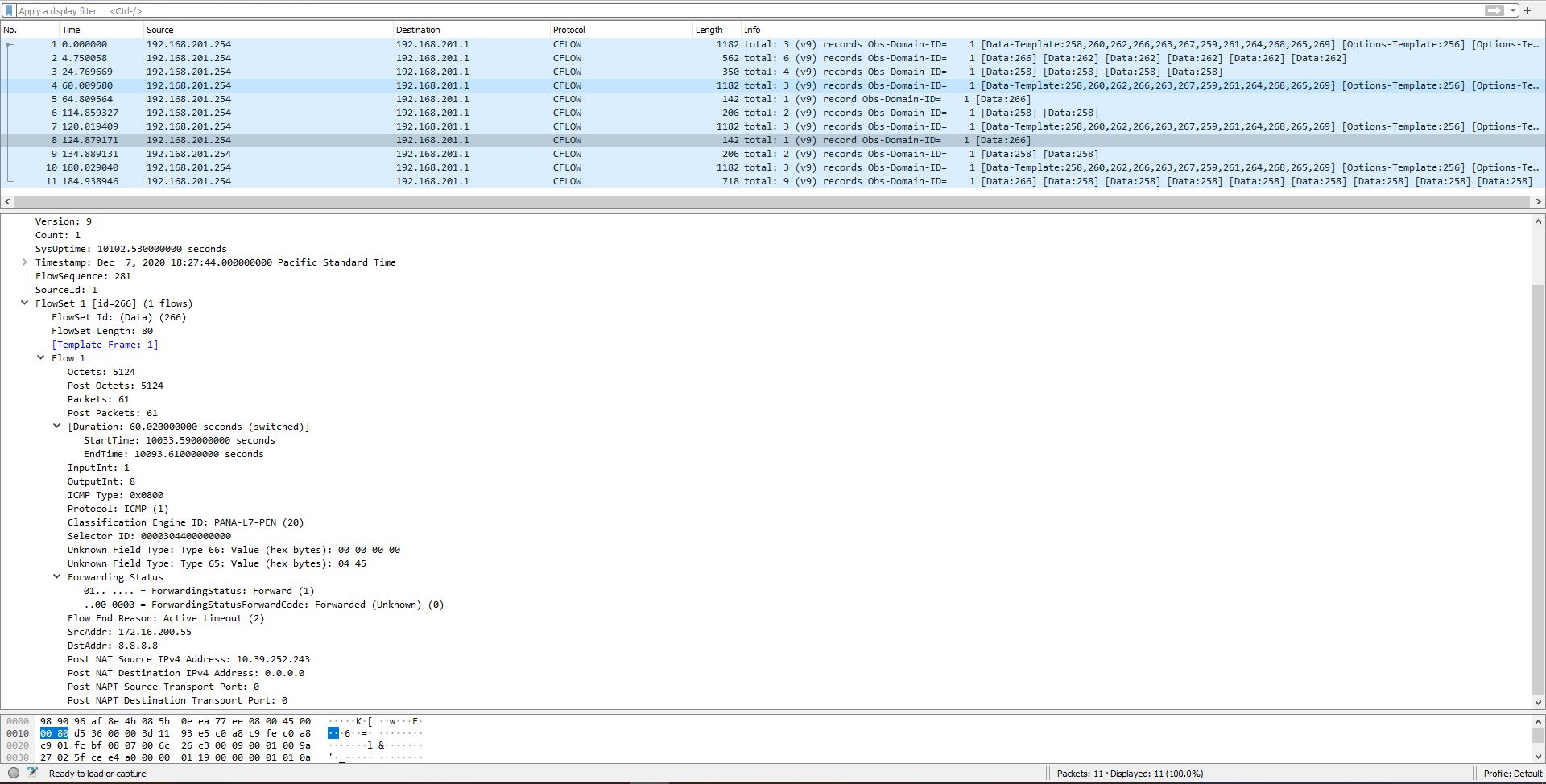 The flowset packet can be captured on UDP port 2055 by a packet analyzer, such as Wireshark:
