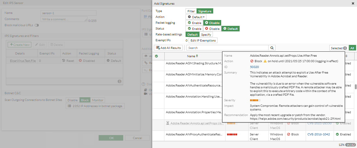 On the Security Profiles > IPS Signatures page, for example, the Adobe.Reader.Annots.api.setProps.Use.After.Free signature is on hold. Hover over the grayed-out entry to view the tooltip, which includes the action and hold time expiry. On this page, all on hold signatures are displayed as on hold regardless of whether override-signature-hold-by-id is enabled.