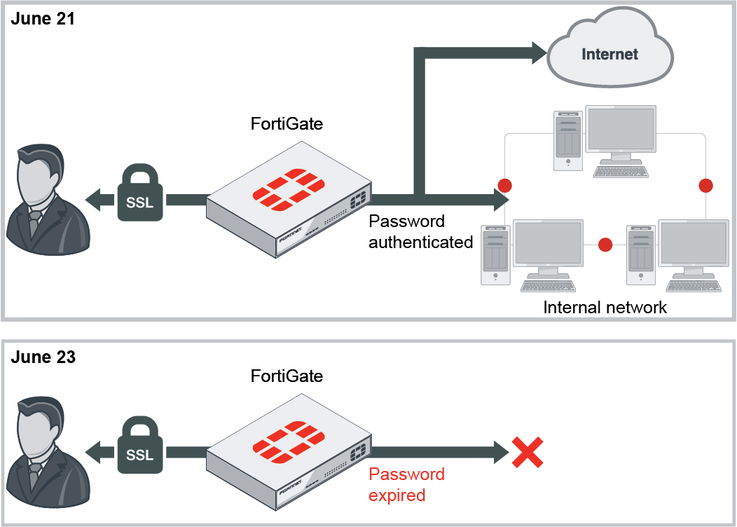 In FortiOS 6.0/5.6, users are warned after one day about the password expiring and have to renew it. If the password expires, the user can still renew the password.