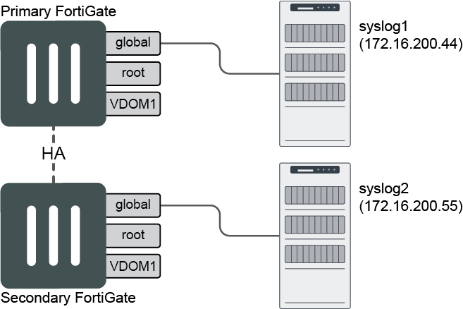 syslog-overridein the secondary HA device root VDOM:config global config system vdom-exception edit 1 set object log.syslogd.override-setting set scope inclusive set vdom root next end end -