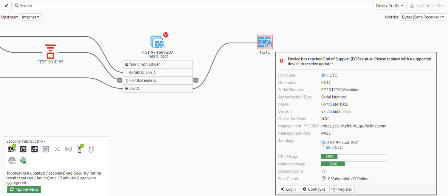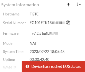 FortiGates, FortiSwitches, FortiAPs, and FortiExtenders can download an EOS (end of support) package automatically from FortiGuard during the bootup process or by using manual commands. Based on the downloaded EOS package files, when a device passes the EOS date, a warning message is displayed in the device's tooltip. The device is also highlighted in the following GUI locations: