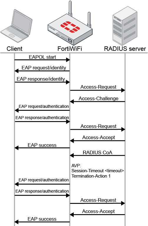 In a wired scenario, a hardware switch configured with 802.1X security authentication can read the Termination-Action attribute value from the RADIUS Access-Accept response. If the Termination-Action is 1, the FortiGate will initiate re-authentication when the session time has expired. During re-authentication, the port stays authorized. If the Termination-Action is 0, the session will be terminated.
