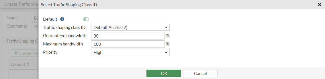 A traffic shaping policy can be used for interface-based traffic shaping by organizing traffic into 30 class IDs. The shaping profile defines the percentage of the interface bandwidth that is allocated to each class. Each traffic class ID is shaped to the assigned speed according to the outgoing bandwidth limit configured to the interface.