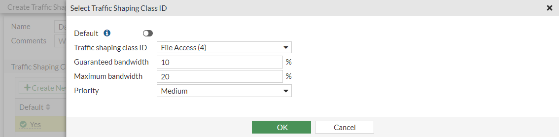 config firewall traffic-class edit 3 set class-name "Web Access" next edit 4 set class-name "File Access" next end -