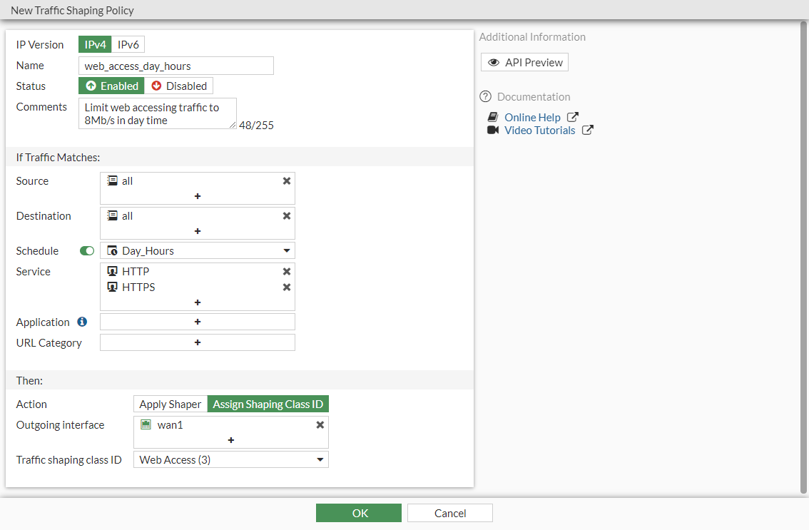 config firewall shaping-policy edit 2 set name "web_access_day_hours" set comment "Limit web accessing traffic to 8Mb/s in day time" set service "HTTP" "HTTPS" set schedule "Day_Hours" set dstintf "wan1" set class-id 3 set srcaddr "all" set dstaddr "all" next edit 3 set name "file_access_day_hours" set comment "Limit file accessing traffic to 2Mb/s during the day" set service "AFS3" "FTP" "FTP_GET" "FTP_PUT" "NFS" "SAMBA" "SMB" "TFTP" set schedule "Day_Hours" set dstintf "wan1" set class-id 4 set srcaddr "all" set dstaddr "all" next end
