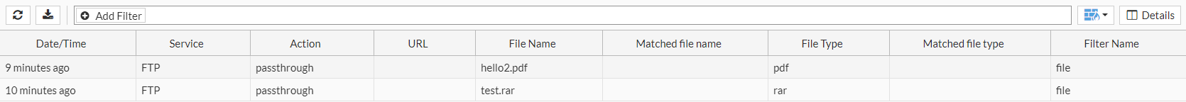 The following example shows how to configure a file filter profile that blocks PDF and RAR files used in a one-arm sniffer policy.