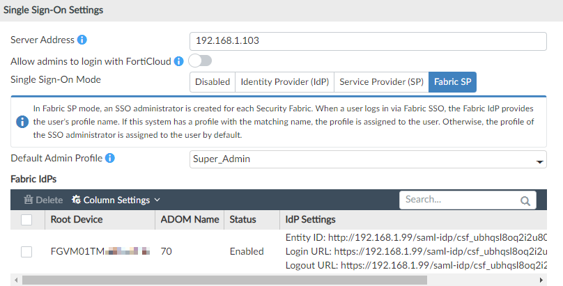 For Single Sign-On Mode, select Fabric SP and enter the address to access the FortiAnalyzer in Server Address.