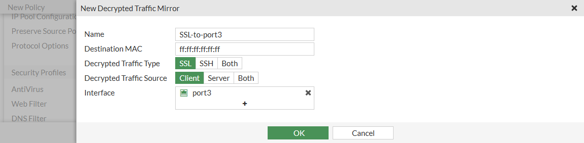 SSL mirroring allows the FortiGate to decrypt and mirror traffic to a designated port. A new decrypted traffic mirror profile can be applied to IPv4, IPv6, and explicit proxy firewall policies in both flow and proxy mode. Full SSL inspection and in flow mode, a security profile, must be used in the policy for the traffic mirroring to occur. Proxy mode must be used if a security profile cannot be applied.