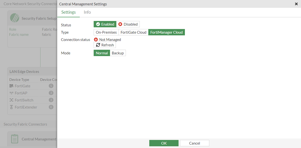 - Go to Security Fabric > Fabric Connectors and double-click the Central Management card.