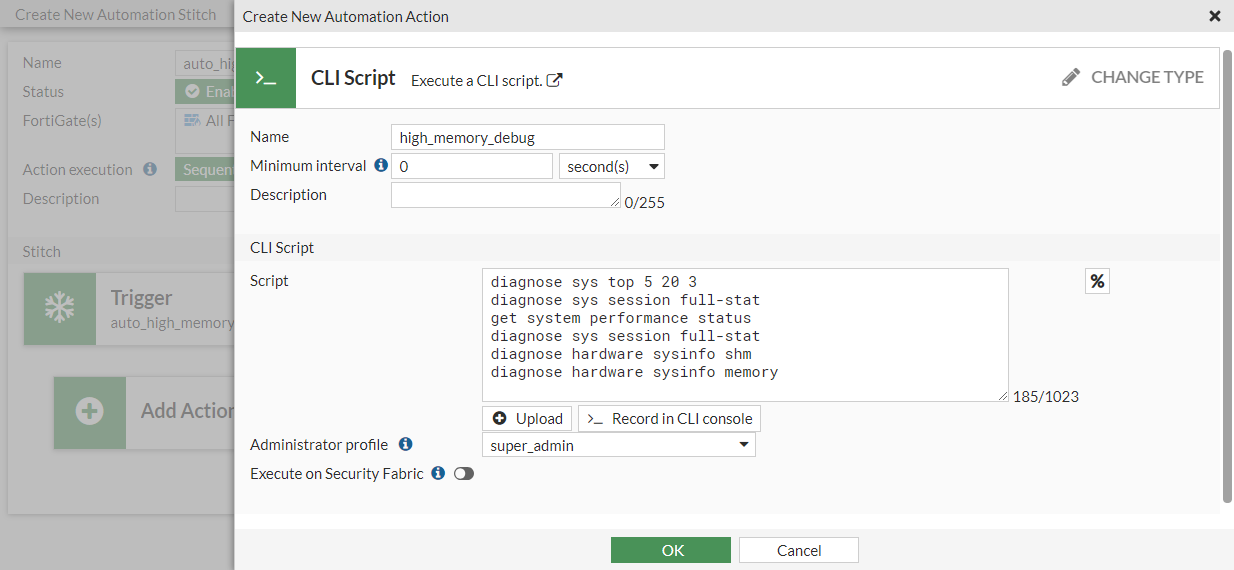 In this example, an automation stitch is created that runs a CLI script to collect debug information, and then email the results of the script to a specified email address when the memory usage causes the FortiGate to enter conserve mode.
